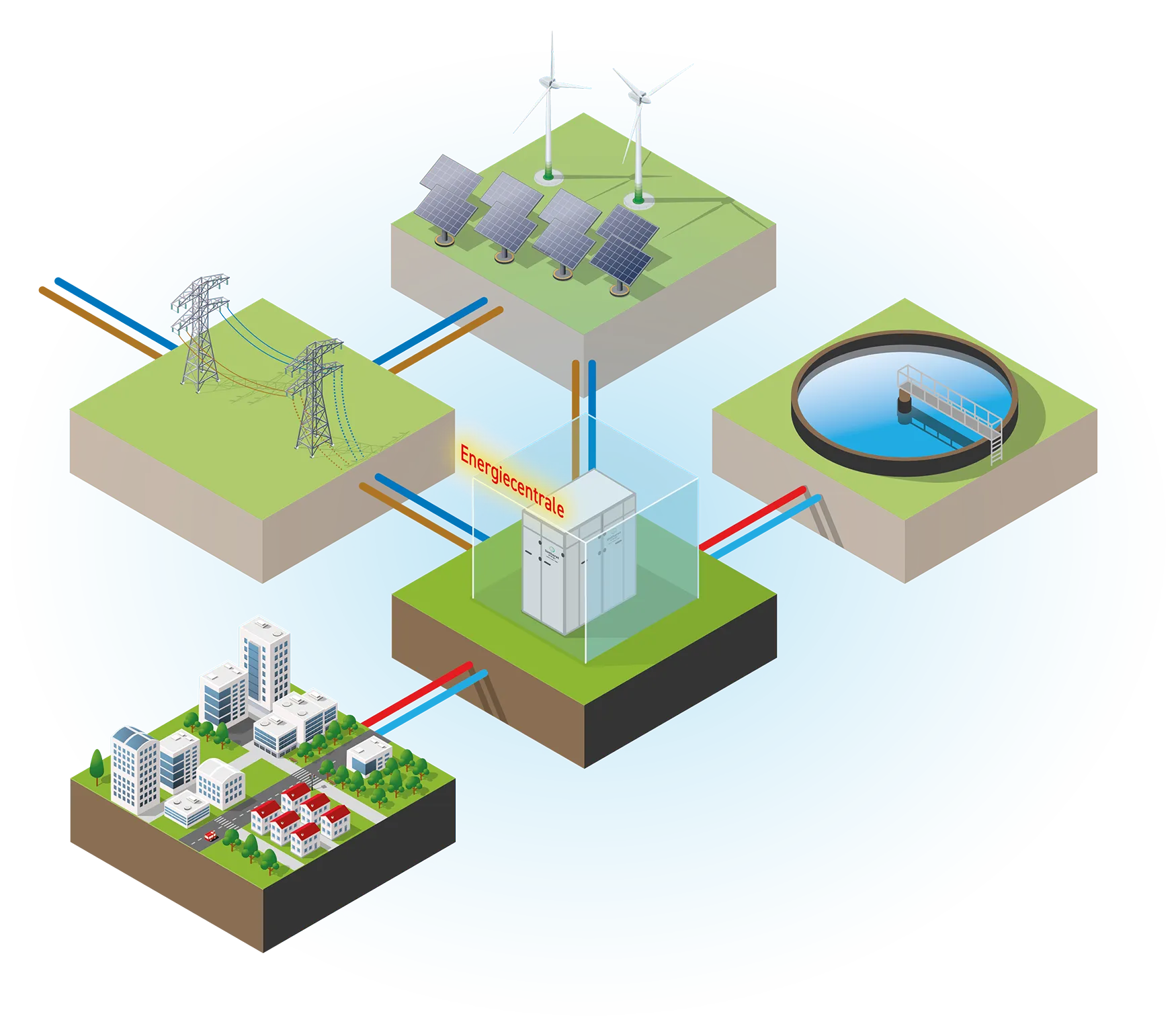 Restwarmte, uit bijvoorbeeld een afvalwaterzuiveringsinstallatie, bodemenergie of oppervlaktewater.